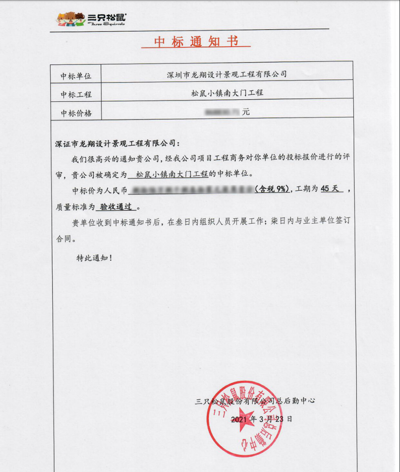 特大喜訊:2021年3月23日,深圳市龍翔設計景觀工程有限公司(簡稱:龍翔景觀)被三只松鼠股份有限公司確定為松鼠小鎮南大門工程的中標單位