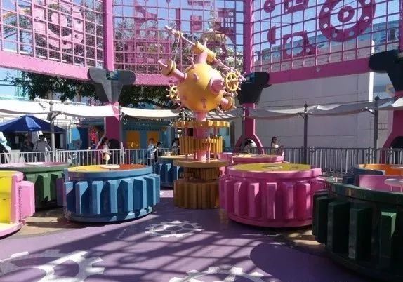 金屬工廠區(qū)包裝:雖然設(shè)備為小項(xiàng)目(裝轉(zhuǎn)杯), 但主題包裝十分具有創(chuàng)意性,運(yùn)用同構(gòu)手法將機(jī)械金屬風(fēng)格與糖果風(fēng)格融合,機(jī)械風(fēng)格符合設(shè)備運(yùn)轉(zhuǎn)方式,糖果風(fēng)格與環(huán)境形成強(qiáng)烈反差,對(duì)設(shè)備針對(duì)的低領(lǐng)兒童客群有很強(qiáng)的吸引力。